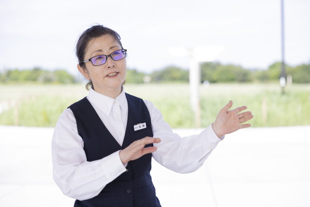 仕事でのこだわりは、この「ひざ掛け」です。以前の職場では制服がスカートだったので、⽇焼け対策として使っていました。今は制服がパンツスタイルになり⽇焼けの⼼配はないものの、今でも、ついつい使い続けてしまっているんですよね(笑)。運転席に座ったら、ひざ掛けを⽤意してシートベルトを締めて、メガネをかけて、という⼀連のルーティンとして染み付いているんです。変化の多い仕事環境の中、この変わらない「ルーティン」が、集中⼒を⾼めているんですよ︕